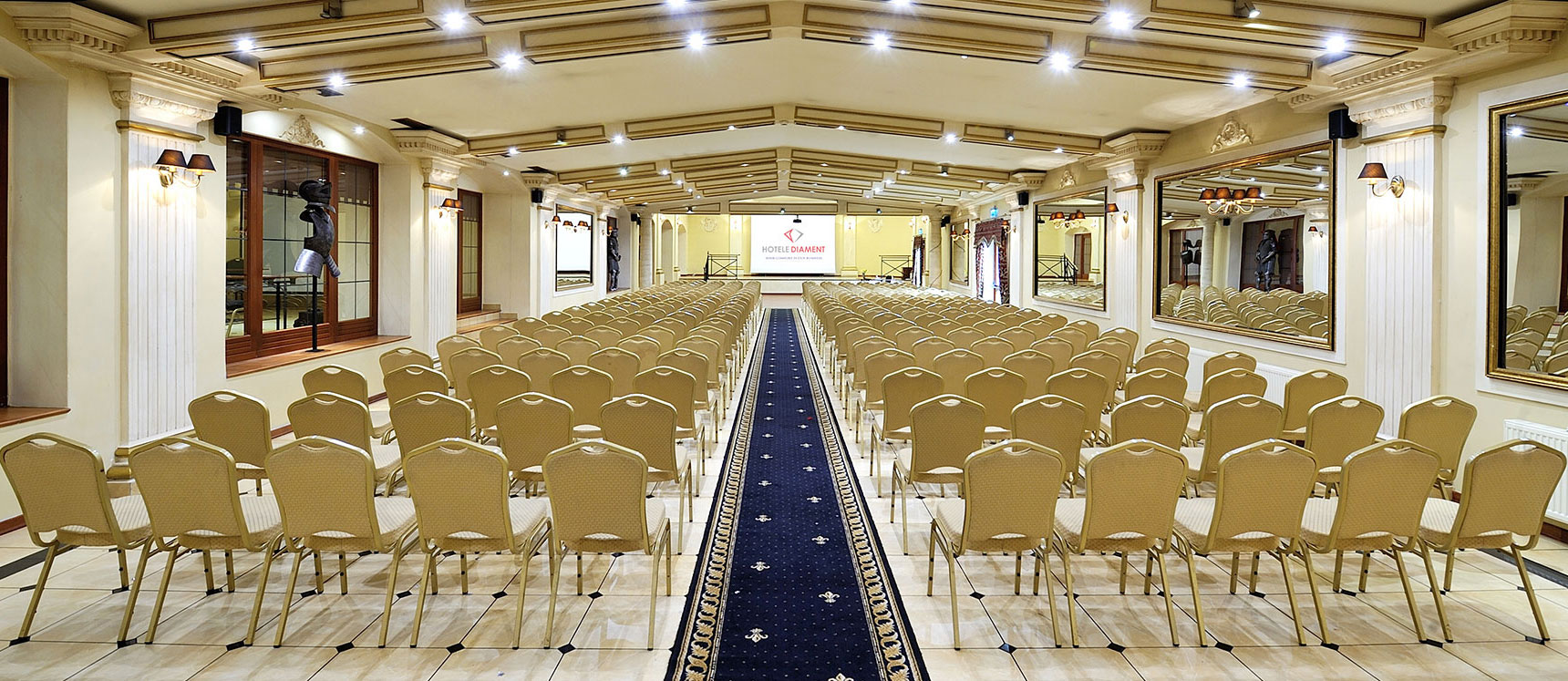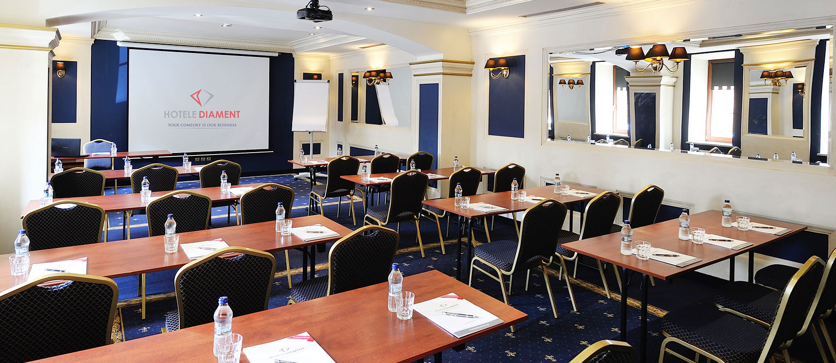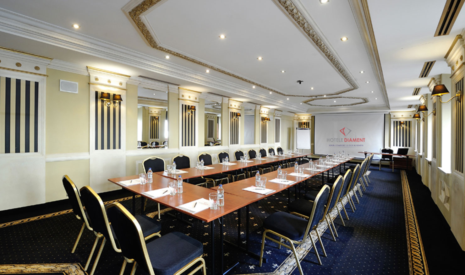 Die Säle sich ausgestattet in: Internetzugang (zzgl. WiFi), Projektoren und Bildschirmen, Flip-Charts und die Cesarska Saal zusätzlich eine professionelle Beschaltung und eine Bühne mit breitem Zugang vom Draußen (Einfahrt von Fahrzeugen ermöglicht).