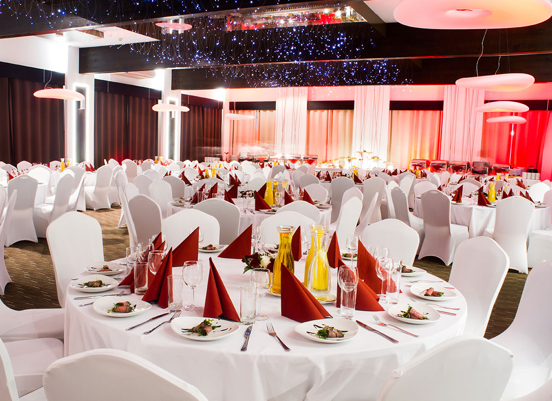 Dzięki kilkunastu ustawieniom stołów i krzeseł sala jest idealnym miejscem na organizację zarówno kameralnych spotkań firmowych, jak i przyjęć dla nawet 500 osób.
