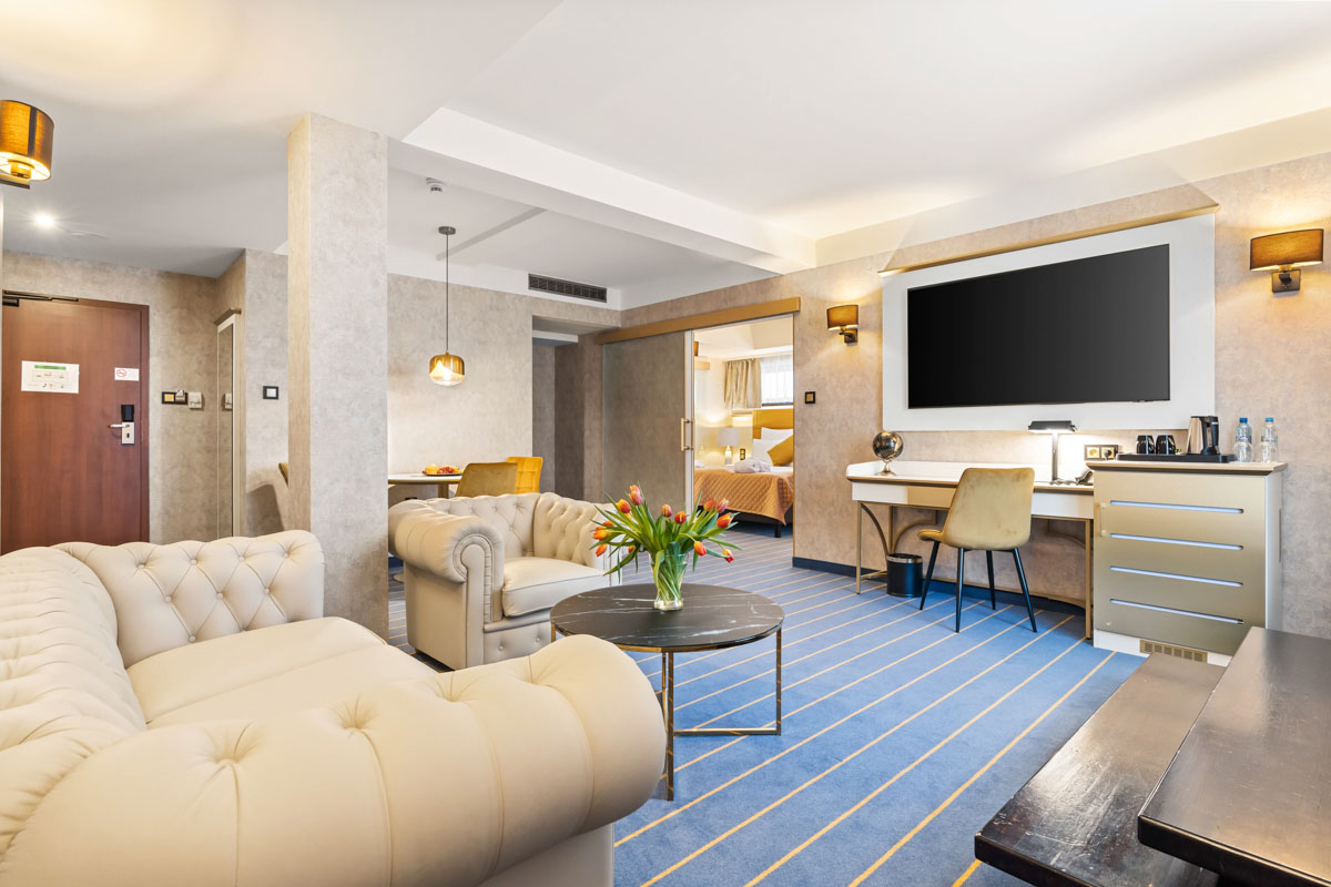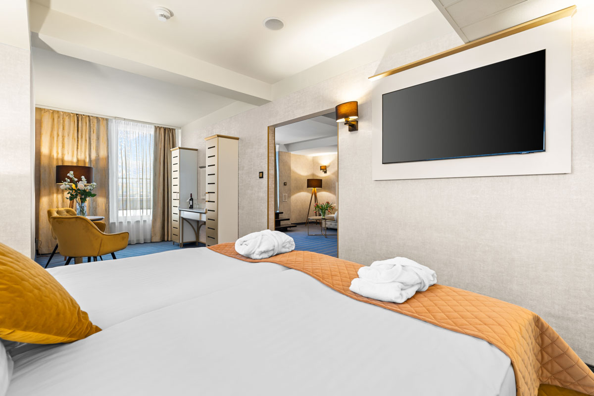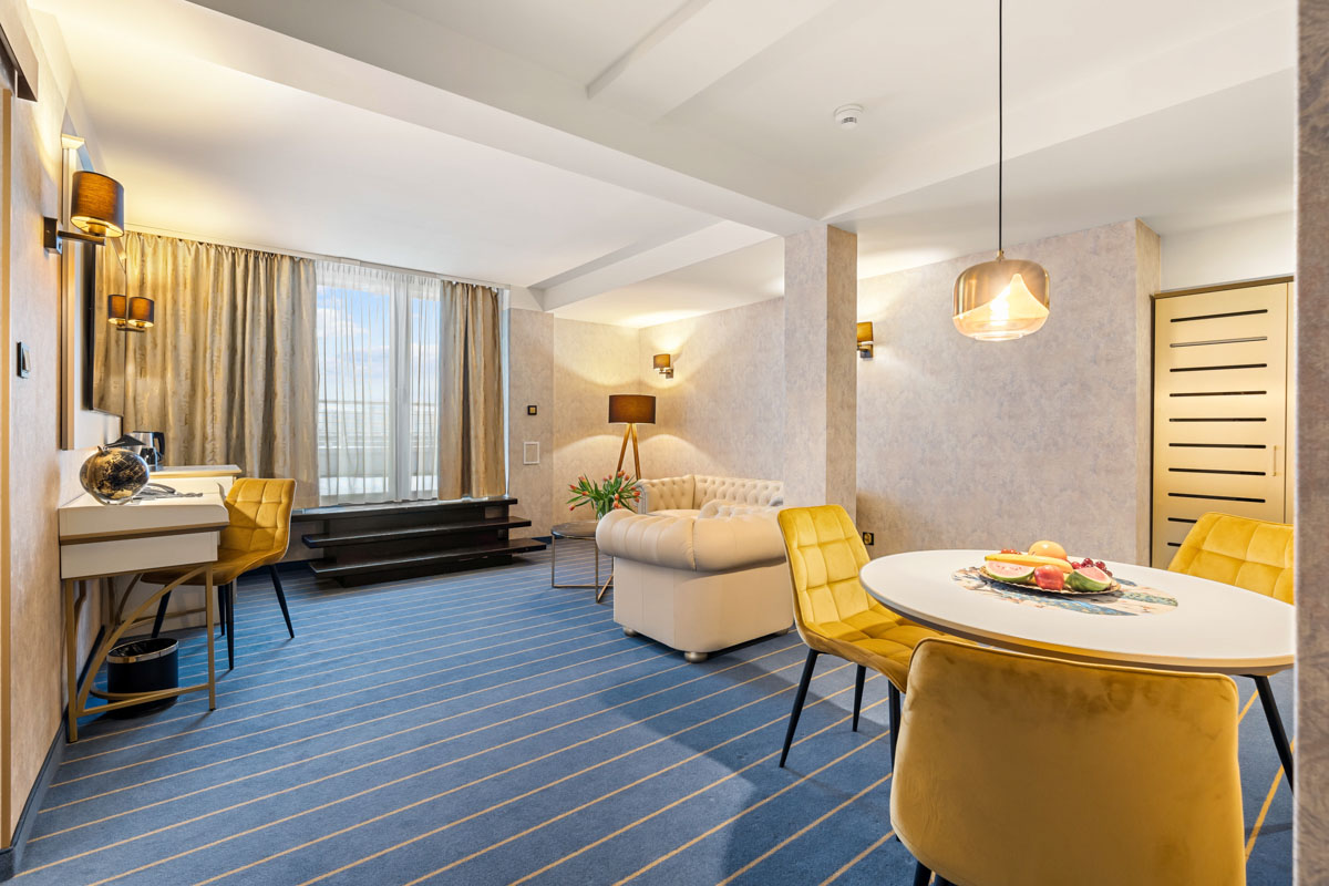Junior Suite zaprojektowany został z myślą o pełnym komforcie nawet najbardziej wymagających Gości. Zapewnia domową atmosferę i oferuje wszelkie udogodnienia potrzebne w czasie podróży biznesowej lub wizyty prywatnej.