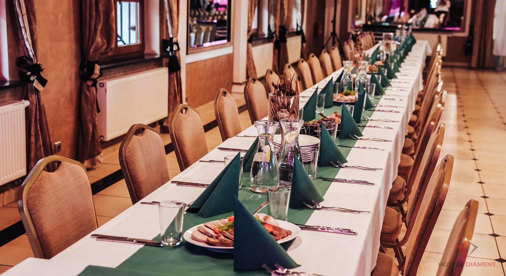 SPA & Wellness Hotel Diament Ustroń**** to miejsce o niepowtarzalnym charakterze, znajdujące się w samym sercu Beskidu Śląskiego. Malownicza okolica sprawia, że obiekt nadaje się doskonale na organizację eleganckiego przyjęcia okolicznościowego. Pełna uroku, uzdrowiskowa okolica sprawi, że będzie to wesele, które zarówno Młoda Para, jak i Goście będą zawsze wspominać z uśmiechem na twarzy. Zapewniamy wyjątkową aranżację wnętrz oraz wykwintne dania, które trafią w nawet najbardziej wymagające gusta. Wykwalifikowana obsługa jest zawsze chętna do pomocy, a organizacja wydarzenia w naszym hotelu gwarantuje satysfakcję z dokonanego wyboru.