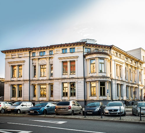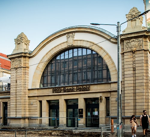 Tuż po wyjściu z lobby Hotelu Plaza Katowice rozpościera się widok na niski, podłużny budynek dawnego dworca kolejowego.