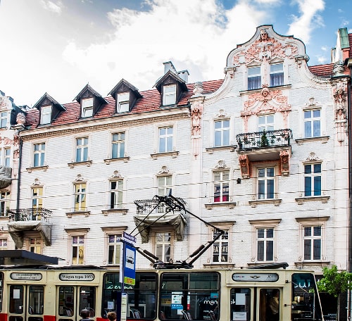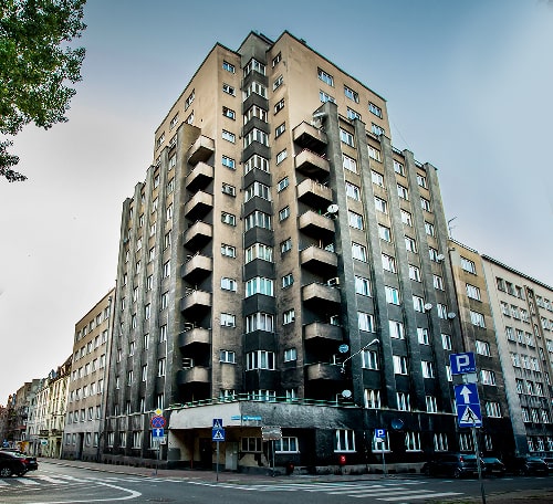 → Plac Wolności opuszczamy ulicą Matejki, a następnie Mikołowską do skrętu w prawo w ul. Żwirki i Wigury. To tu, w niedalekiej odległości znajdują się dwa modernistyczne budynki. →
