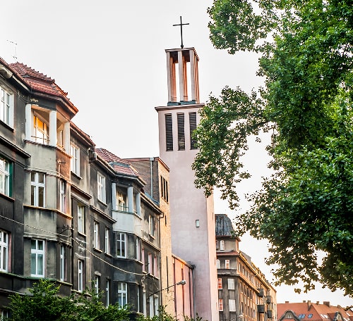 → Skręcamy w lewo z ul. Żwirki i Wigury w ul. M.C. Skłodowskiej i po kilkuset metrach dochodzimy do Kościoła Garnizonowego. →